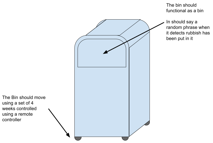 To come up with projects, I was looking around me for ideas when I saw a bin, which reminded me of a video I recall seeing of a bin at Disney that moves around and talks to people. I thought this was a cool idea and wanted to put my own spin on it.